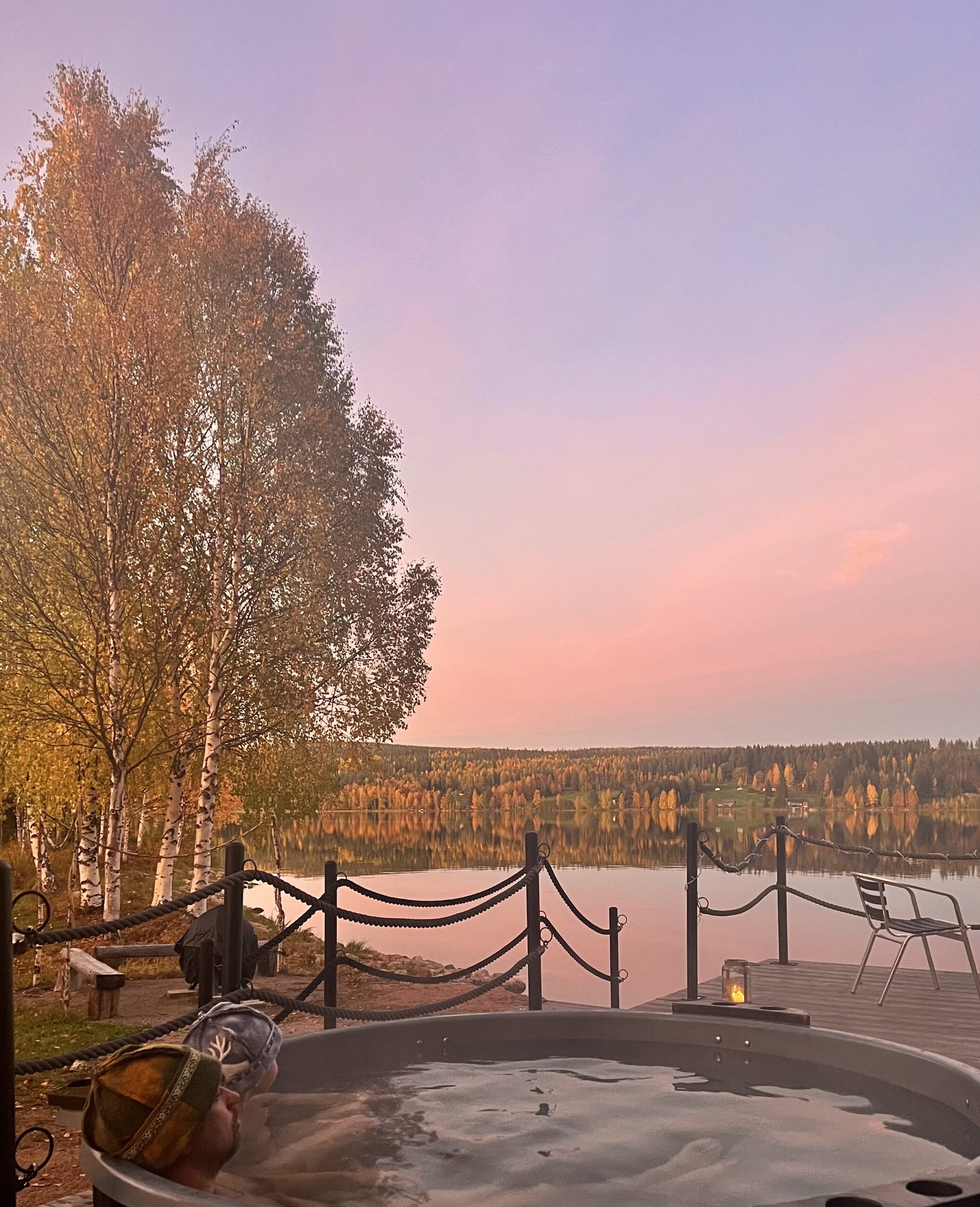 We take care of heating the sauna and hot tub. Next to the sauna, there is a lounge room for changing clothes and relaxing between sauna sessions or hot tub dips. In the sauna, you wash yourself with lake water using a scoop and water container. The hot tub is also filled with lake water. We provide traditional Finnish shampoo and soap. After your experience, you can unwind in the lounge room or outside by the campfire.